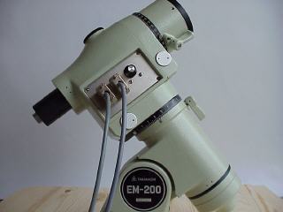 Die beiden Kabel gehen zur FS2, und an dem Drehknopf kann die Helligkeit der Polsucher-Beleuchtung eingestellt weren. Takahashi EM200 mount with FS2 The two cables lead to the FS2 drive unit, and the turnknob is used to adjust the brightness of the polar alignment scope. |